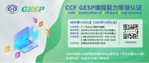 CCF GESP第12次认证时间为2025年12月27日,1-4级认证时间为上午9:30-11:30,5-8级认证时间为下午13:30-16:30。11月4日17:00开启第12次认证报名通道,考生可登录GESP官网进行报名。GESP认证方式为全国各GESP考点上机考试,认证语言包括:C++、Python和图形化编程三种语言,其中C++和Python编程分为1-8级,图形化编程分为1-4级。