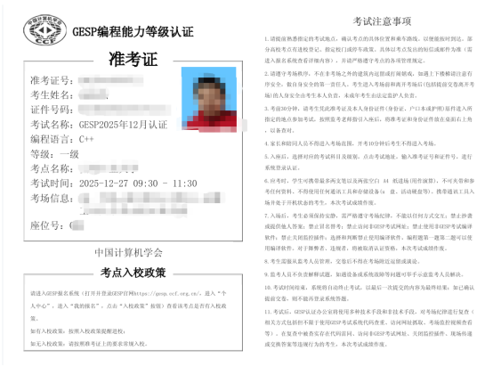 GESP第12次认证将于2025年12月27日在全国各GESP考点进行线下机考,1-4级认证时间是上午9:30-11:30,5-8级认证时间是下午13:30-16:30。认证语言包括:C++、Python和图形化编程三种语言,其中C++和Python编程为1-8级,图形化编程为1-4级。考生可于即日起登录CCF GESP官网(https://gesp.ccf.org.cn)查看并下载准考证,具体下载时间为12月22日17:00至12月27日9:00,请广大考生及时下载并打印准考证,仔细核对准考证上面的信息,以免错过此次认证。