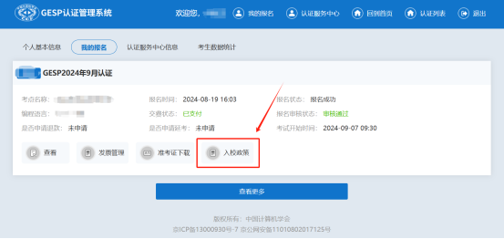 2.GESP部分高校考点有进校登记、指定校门或停车政策。考生可进入GESP报名系统(打开并登录GESP网站https://gesp.ccf.org.cn/,进入“个人中心”,进入“我的报名”,点击“入校政策”按钮)查看该考点是否有入校政策。敬请家长和考生严格遵守考点学校的各项规则,并积极配合考点的相关安排。入校政策查看方式参考下图: