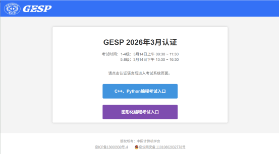 CCF GESP第13次认证将于2026年3月14日上午9:30正式开考,1-4级认证时间为上午9:30-11:30,5-8级认证时间为下午13:30-16:30。认证语言包括:C++、 Python和图形化编程三种语言,其中C++和Python编程为1-8级,图形化编程为1-4级。请考生于3月14日9:30前登录CCF GESP网站(https://gesp.ccf.org.cn)下载并打印准考证,考生须携带纸质准考证及身份证件原件提前30分钟到达相应考点。预祝各位考生考试顺利,取得好成绩。