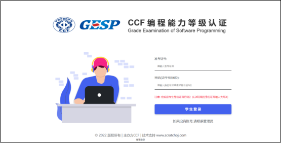 (1)登录考试系统,C++、Python、图形化编程登录账户:准考证号码;所有语言登录密码:考生身份证件后6位(以X结尾的身份证号输入大写X,通行证中有括号的用英文括号)。