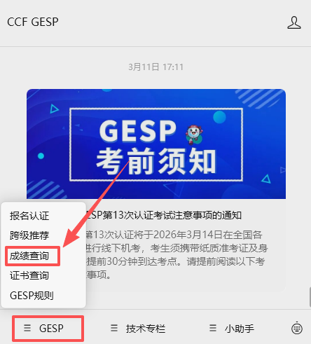 CCF GESP微信公众号成绩查询示例图